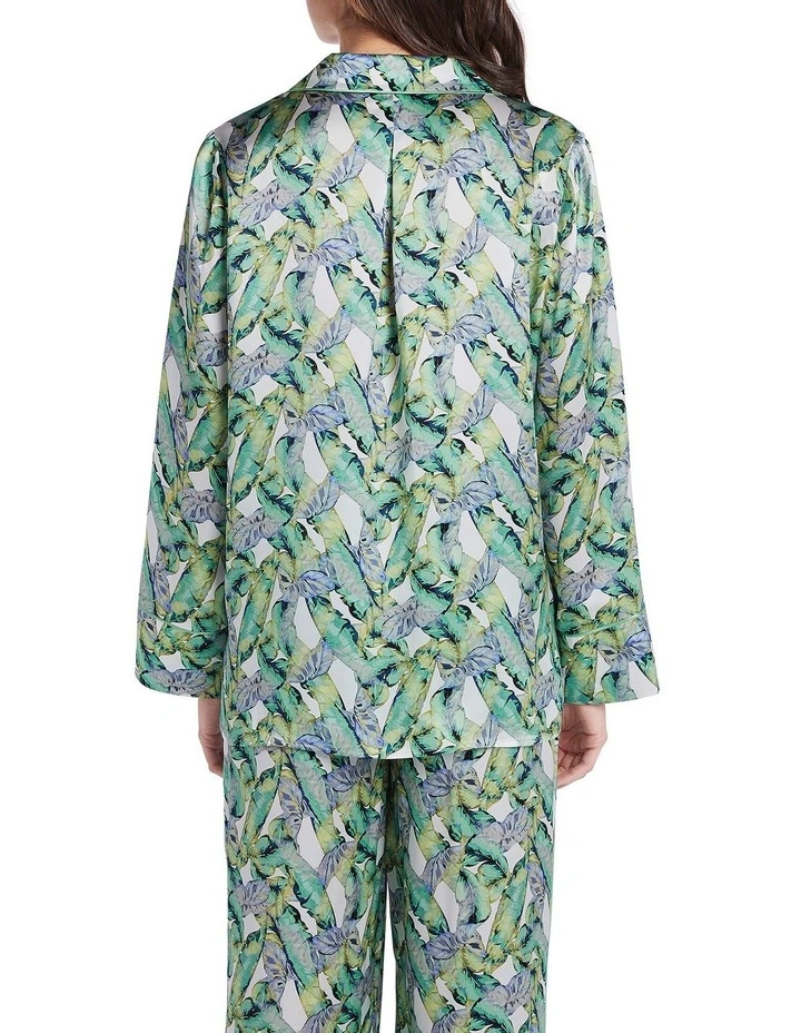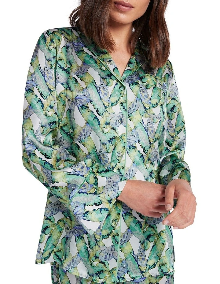 Pairing delicate green piping with a gorgeous leaf print, this pyjama blouse feels entirely effortless as it flows through pure silk to reveal loose, relaxed shaping. Fastening at the front with fabric-covered buttons, the blouse also features a resort collar, long sleeves with relaxed, open cuffs, a single patch pocket at the chest, and a deep pleat at the back yoke for shaping.