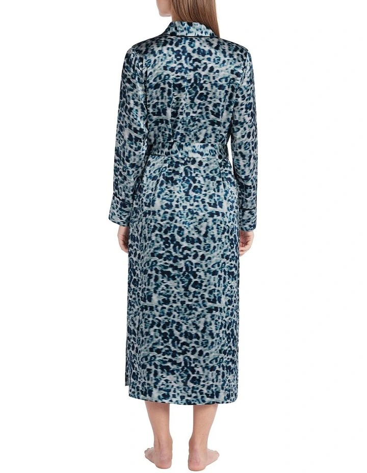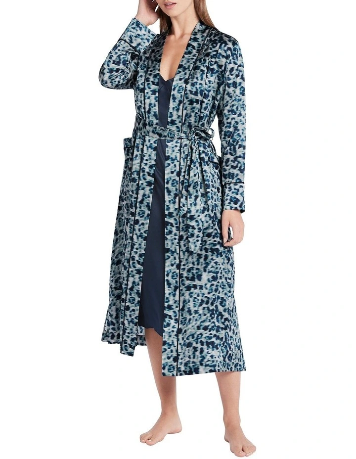 Pairing soft shades of blue with midnight blue trim, this robe skims over the skin in pure silk, to reveal easy, relaxed shaping drawn in at the waist with a self-tie fabric belt. Descending to midi length, the robe delivers further design detail in belt loops at the waist, large patch pockets at the hip, deep side seam splits at the hem, and long sleeves with loose, open cuffs.
