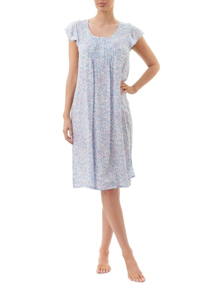 Soft, light and cool- pretty blue print short nightie. Front placket with button opening, and soft pin tuck pleats either side.Β Β Β Β Β Β Β Β