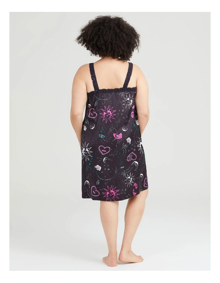 Be cool, comfortable and chic through the night even day in this Satin Zodiac Lace Nightie. This plus sized midi length nightie features laced singlet sleeves and a round neck. With a Taking Shape exclusively-designed Zodiac print, this luxurious, soft satin nightie is a midnight must-have. Measures: 77.5cm long from centre back neck to hemline on a size 14.